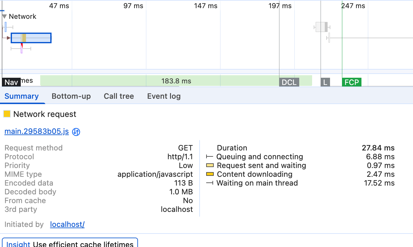 서비스 로드 과정에서 네트워크 요청을 시간 순서에 따라 보여줌. 오래걸리는 작업은 클릭하여 선택후 하단 탭의 summary를 통해 문제 파악 가능.