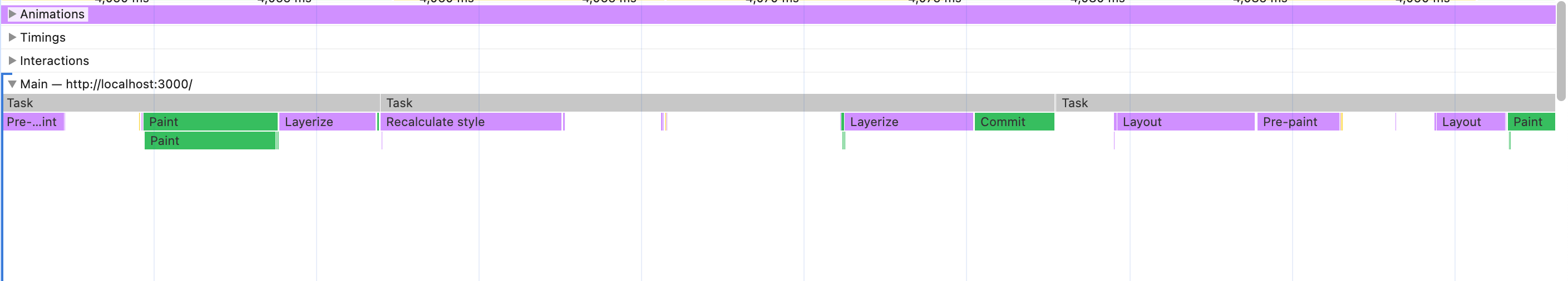 현재 width 로 애니메이션을 조절하다보니 리플로우 작업(layout 시작~paint끝)이 1frame(1/60초)동안 끝나질 않는다.