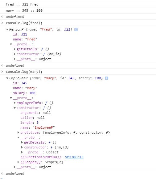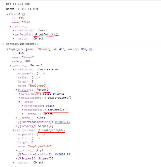 PersonC 를 상속받고 있는 EmployeeC의 구조는 복잡하다. 하지만 한가지만 알면된다. PersonC의 getDetails 가 선언된 장소가 prototype안에 constructor안에 prototype 안에 있다. 이 의미는 바로 EmployeeC 클래스 안에 getDetails 메서드가 override 되어있지 않으면 getDetails 메서드의 정의를 찾을 때까지 prototype을 깊게 탐색한다는 것이다.